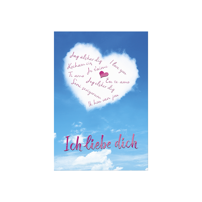 Die Karte zeigt ein großes Herz, das aus vielen verschiedenen Sprachen zusammengesetzt ist. In jedem Abschnitt des Herzens steht der Satz „Ich liebe Dich“ in einer anderen Sprache – von „Je t'aime“ bis „I love you“ und „Ti amo“. Die Wörter formen gemeinsam ein harmonisches, Wolkenherz. Unterhalb des Herzens steht in eleganter Schrift der Satz: „Ich liebe dich“, der die Botschaft der Karte klar und kraftvoll abrundet. Diese Karte ist perfekt, um Gefühle universell auszudrücken und auf liebevolle Weise zu zeigen, dass Liebe keine Grenzen kennt.